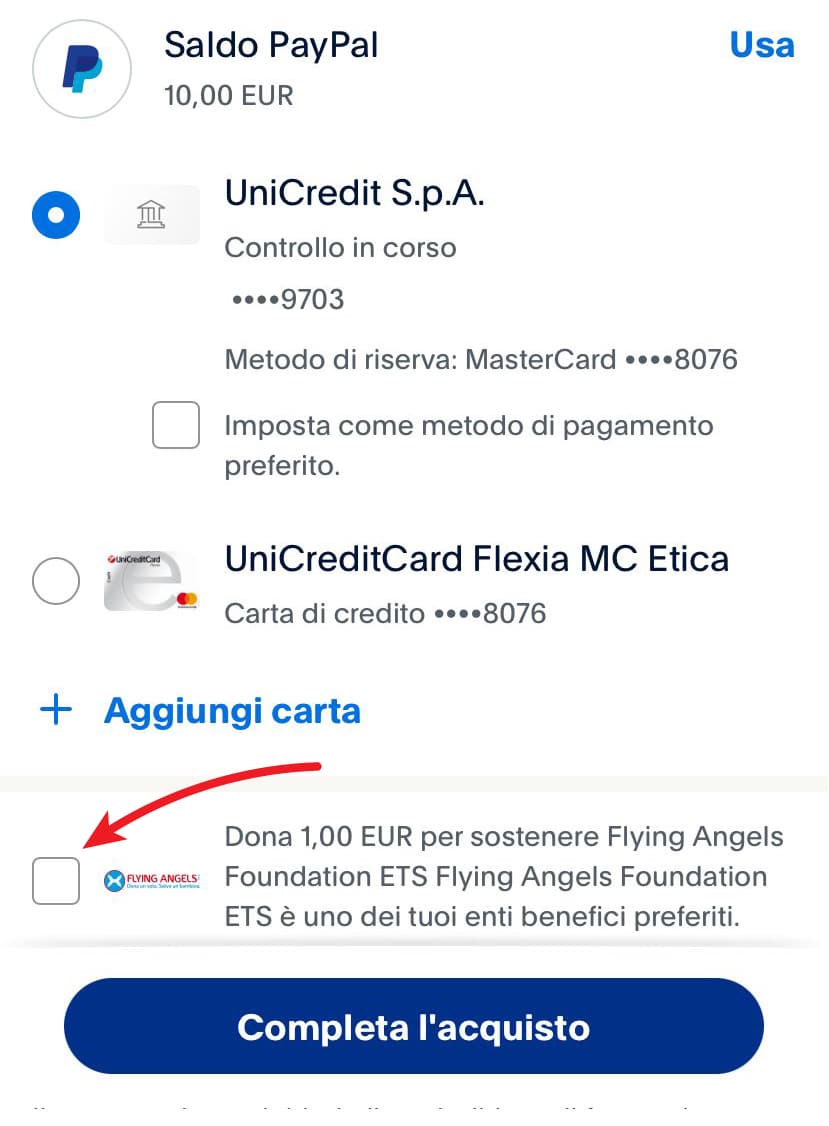 Imposta Flying Angels come ente di beneficenza preferito nel tuo account o nell’app PayPal, in modo che venga aggiunto automaticamente al checkout.